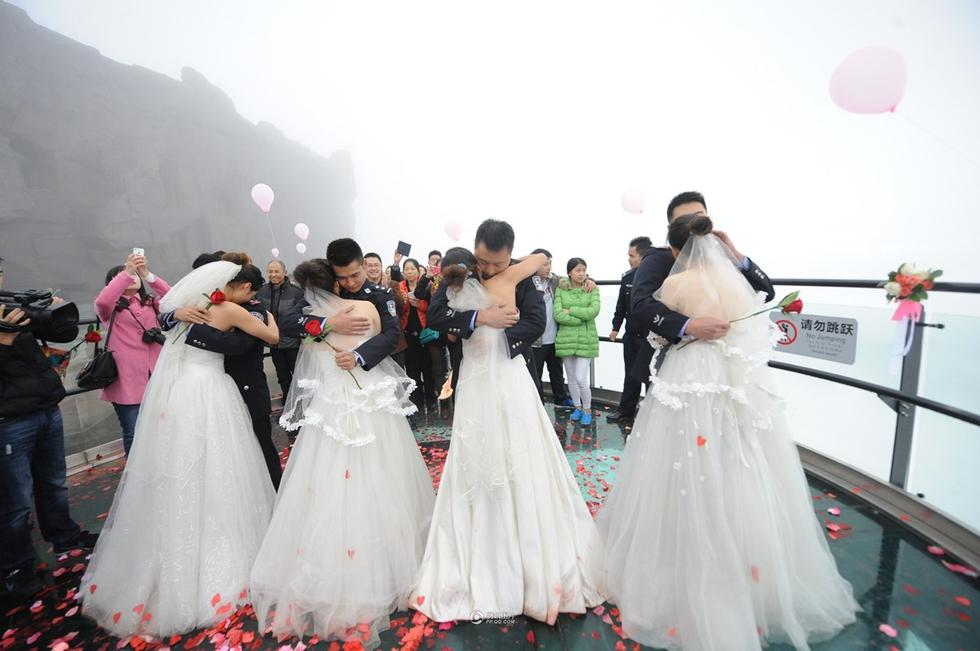 看到女友单膝跪地,何涛和其他三位民警激动地抱起了各自的女友,深情相拥满眼都是泪水。