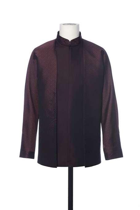 男领导人服装采取了立领、对开襟、连肩袖,提花万字纹宋锦面料、饰海水江崖纹的设计。