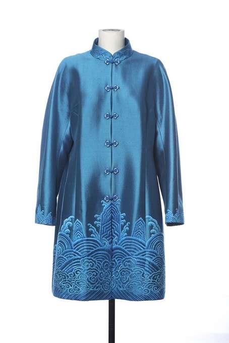 女领导人服装为立领、对襟、连肩袖,双宫缎面料、饰海水江崖纹外套。