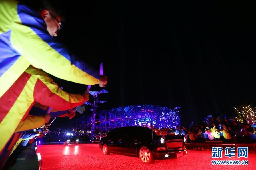 11月10日晚,出席亚太经合组织领导人非正式会议的经济体领导人和代表车队抵达北京国家游泳中心“水立方”。当晚,2014年APEC领导人欢迎宴会在北京国家游泳中心“水立方”举行。 新华社记者 王申 摄