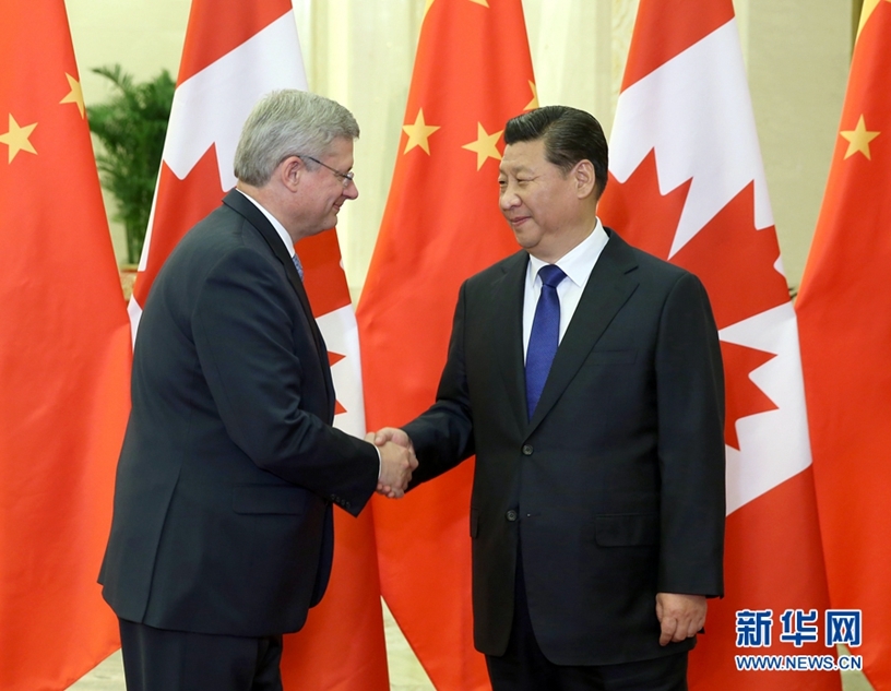 11月9日,国家主席习近平在北京人民大会堂会见加拿大总理哈珀。