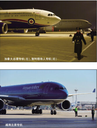 几日来,在首都机场严阵以待的武警官兵和各领导人专机最夺人眼球。最多时,20多架领导人专机抵京,从波音747、波音737、空客340、空客330,到伊尔-96、猎鹰900等,10余种机型各展风采,像是一场不对外开放的小型飞机博览会。