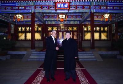 晚上的中南海,水波荡漾,树影婆娑。习近平在瀛台前迎接奥巴马,两国元首亲切握手,互致问候。习近平说,你这次访问日程很紧。我们既安排了国事访问的正式活动,也安排了一些轻松场合。希望你的访问愉快,取得丰硕成果。