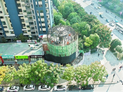 这个“鸟笼”位于新华路与马场路交会处。记者在现场看到,“鸟笼”栏杆由钢质材料做成,约有4层楼高。“鸟笼”内,从一楼到三楼,正在装修。