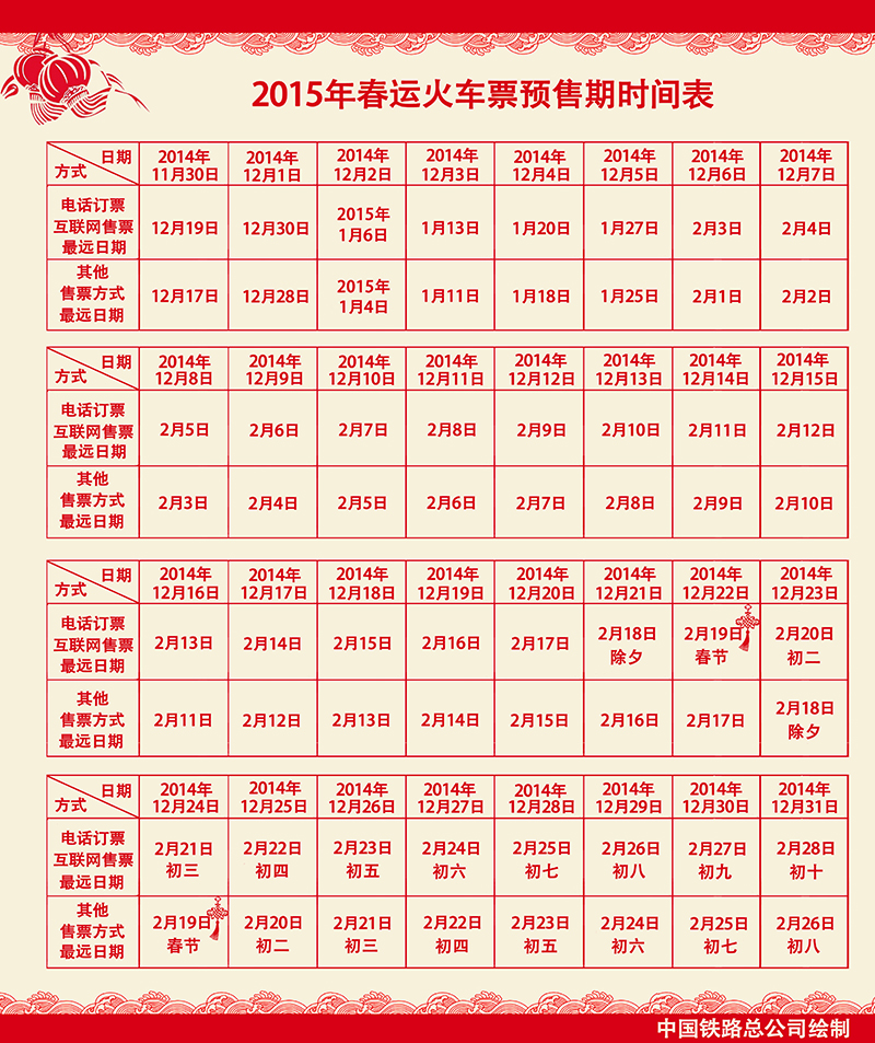 2015年春运火车票预售时间表出炉 客票预售期将延长至60天(图)