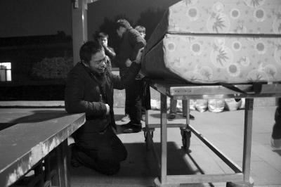 殡仪馆外,京京父亲在棺材前长跪不起,不舍得送别儿子。京华时报记者谭青摄