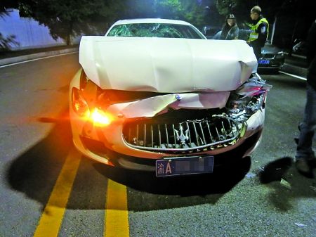 民警赵洋立即与同事赶到现场,看到一辆白色玛莎拉蒂总裁轿跑车,追尾撞裂前面一辆黑色路虎越野车后保险杠。玛莎拉蒂引擎盖高高翘起,前保险杠和左灯均被撞坏,前挡风玻璃也被撞得破碎条纹密如蛛网,两个安全气囊全被弹开。