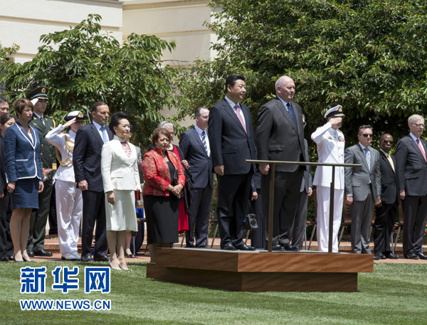 11月17日,中国国家主席习近平在堪培拉会见澳大利亚总督科斯格罗夫?;峒?,科斯格罗夫在总督府草坪为习近平举行隆重欢迎仪式。习近平和夫人彭丽媛抵达时,受到科斯格罗夫总督夫妇热情迎接。新华社记者李学仁 摄