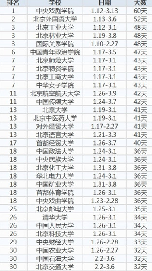 你的学校上榜了吗:史上最长寒假来袭 中戏60天笑傲群雄