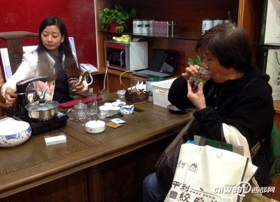 家住朝阳区的刘桂莲和丈夫利用周末到茶城买茶,看到陕西茶城开业,就特地进来了解,品尝陕西茶后,不由得竖起了大拇指。当她听茶城工作人员介绍了陕西茶生长环境、富含锌硒、无农残留等特点后,当即买了三盒产自汉中宁强的雀舌茶。
