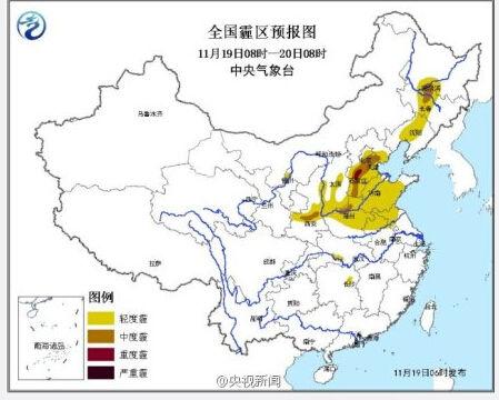人民网北京11月19日电 据中央电视台新闻中心官方微博消息,今晚20时至明晚20时,北京、天津、河北、河南、山东、山西、陕西等地有中度霾,其中北京中南部、河北南部沿山地区、天津北部等地局地有重度霾,部分地区夜间至上午还有大雾,局地能见度低于500米。明天夜间起,华北地区的雾或霾将自北向南逐渐减弱或消散。