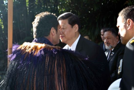 ?。?010年6月17日,习近平访问新西兰,在总督府出席新西兰总督萨蒂亚南德为他举行的传统毛利人欢迎仪式。这是仪式结束时,习近平与毛利领队行毛利人传统礼节——碰鼻礼。新华社记者刘卫兵摄)