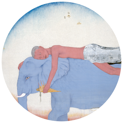 “当代工笔专题”作为开场,作品精彩汇聚。包括了徐华翎《青春》、《影调》、张见《棕榈树》、杭春晖《表演》、涂少辉《祥云系列》、 杨立奇《锦鸡》、祝铮鸣《空空行》、周雪《游梦》、高重飞《起舞》、《水云间之三》、《香正浓之五》、沈宁、罗寒蕾、孙震生、范春晓、李娜等精品之作。其中祝铮鸣的《空空行》是画家重要的代表作之一。画面中一位半裸青年,手持代表神圣珍贵的藏传佛教法器的海螺,俯卧在象背上。对佛教形象的运用也许如祝铮鸣自己所言“并非刻意为之”,而是她日常接触到的佛教文化不断耳濡目染的必然结果,流露在她画面中的空幻意识和隐逸心理也开始变得更加明确。事实上,对古老文明的感怀、对魔幻文学的偏爱、内向的性格以及置身人群却无所依托的孤独感,当所有这些因素同步抵达生命的中的某一个点,并且与“空观”相连时,便产生了《空空行》这样的作品。