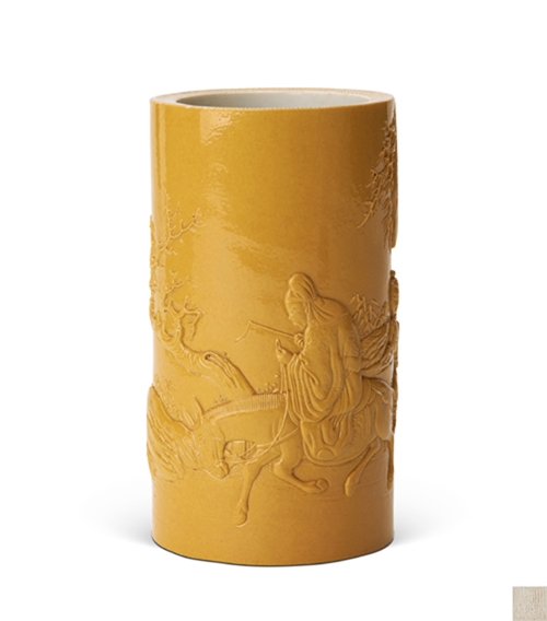 封面精品“黄釉仿竹形踏雪寻梅图笔筒”, 釉色及浮雕装饰均刻意仿竹雕笔筒的艺术效果,色泽纯净浮雕纹饰意境深远,刀工技法精湛,其外壁以踏雪寻梅经典题材为意境。笔筒作竹尊式,竹节横膜为底,厚壁宽足,口、足阴刻钉点缀饰外壁及口沿施淡黄色釉,内壁白釉,底部刻“大清道光年制”六字篆书款。是道光官窑精品。