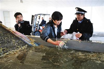执法人员正让一名员工从洗豆芽池内取样,准备带回检测化验。