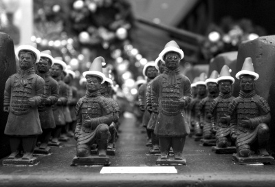 这是11月23日拍摄的巧克力兵马俑。为迎接圣诞节,陕西西安香格里拉大酒店的10个甜点师用10天时间、200斤巧克力创作完成的近300个戴圣诞帽的微缩兵马俑模型日前集体亮相,吸引了公众的目光。新华社发