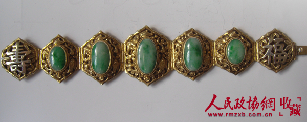 中华民国制银镀金福寿镶绿翠手链_副本