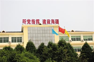 伪造的“华东国防海防教育基地建设指挥部”。租来的办公楼楼顶立着“听党指挥 建设海疆”8个红色大字。记者 萧辉 摄