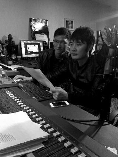 歌词作者宋志刚(左)与主唱余润泽在一起琢磨歌曲旋律。郑州晚报记者石闯摄