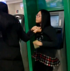 女汉子ATM掐架 被打女子大喊:我项链两千多