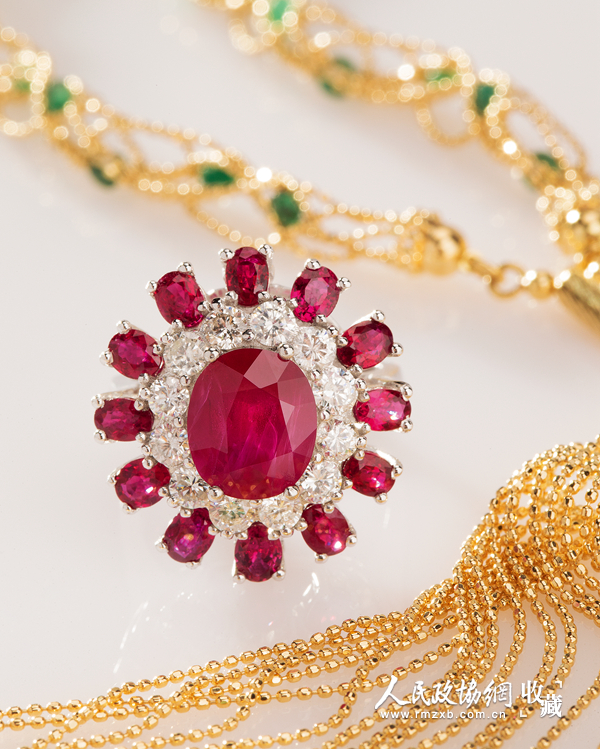 其中,缅甸红宝石在国际珠宝市场上一直有着重要的地位,并在近年亚洲市场中,大受藏家欢迎,其主要因含有丰富的Cr2O3,w(Cr2O3)约 2%~3%,而具有鲜艳的玫瑰红色一红色。其中,其颜色最高品质者被誉为“鸽血红”色。所谓“鸽血红”是一种颜色饱和度较高的纯正的红色,由于含氧量比较高,所以有一种凝动的感觉,而非淡淡一抹可以比拟。