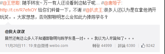 有网友神吐槽:“居然还有这么多人不知道郭敬明与陈学冬是一对……我以为人尽皆知了…… ”