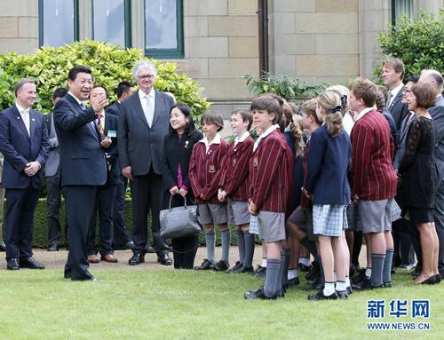 国家主席习近平在澳大利亚塔斯马尼亚州与朗塞斯顿市斯科奇-欧克伯恩小学的小学生在一起。新华社记者 姚大伟 摄