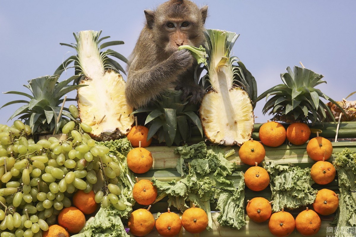 当地时间2014年11月30日,泰国华富里府,一年一度的猴子自助餐节举行。这一节日是在每年11月的最后一个星期日举行,意在推动当地旅游业的发展。总重约2吨的水果、蔬菜、点心、糖果和汽水用来“宴请”生活在这个城市的猴子,感谢他们为该地吸引了游客。CFP