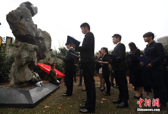 11月29日,来自南京航空航天大学金城学院的近百名大学生来到侵华日军南京大屠杀遇难同胞花神庙地区丛葬地,手捧他们用萝卜刻出来的长明灯,向遇难同胞默哀静思,并朗诵爱国诗歌,以此来牢记历史、勿忘国耻。侵华日军南京大屠杀遇难同胞花神庙地区丛葬地位于南京雨花台区花神大道旁边,纪念碑由一块巨石做成,一段“自1938年1月至2月的40余日内,共掩埋了中国军民尸体7000余具……”的碑文述说了那段惨痛历史。中新社发 泱波 摄