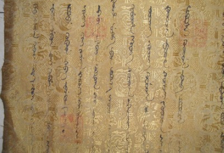 这幅圣旨材料为提花锦缎,整体底衬是纵横交错的云彩图,总长1.6米,宽0.31米,用汉文和满文两种文字书写。圣旨正文,汉文部分用楷书书写,共计18行,318个汉字;满文部分共计22行。