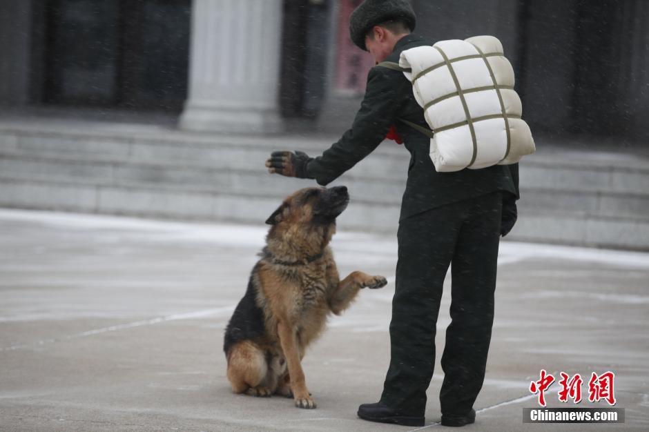 2014年11月30日,退役哨兵熊星与军犬“小龙”告别。中新社发 魏建顺 摄 图片来源:CNSPHOTO