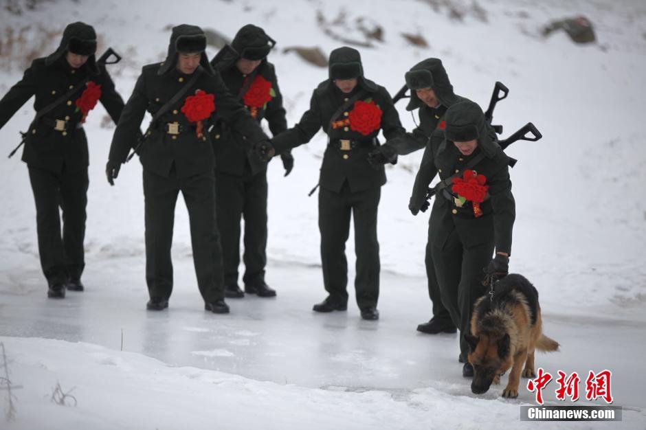 2014年11月30日,哨兵熊星与军犬“小龙”最后一次巡逻。中新社发 魏建顺 摄   图片来源:CNSPHOTO