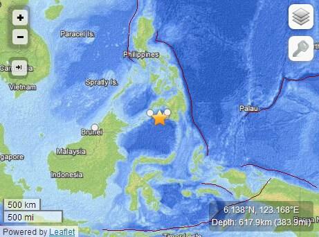 中新网12月2日电 据美国地质勘探局网站消息,北京时间12月2日13时11分,菲律宾西南部棉兰老岛附近海域发生里氏6.3级地震,震源深度617.9公里。此次地震震中距棉兰老岛102公里。