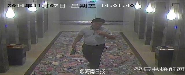 据阿强提供的视频显示,2014 年11月7日,一名年约50 多岁的男子到该酒店前台开房,14 时02 分,该男子乘坐客乘电梯上到22 层2211 房,几分钟后,一位戴眼镜的女子从地下车库乘坐消防电梯也上到22 层,摁了2211 房间的门铃后,进入该房间。然后直到17 时14 分,该男子才从房间里拎着一瓶饮料出来,嘴上叼着一根烟,大摇大摆走到客梯处等候电梯下楼。21 时10 分,男子再返回酒店房间,23 时32 分才离开……