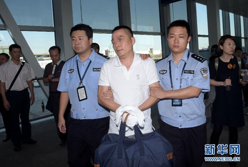 9月27日,在“猎狐2014”专项行动中抓获的犯罪嫌疑人庞某被押解回国。当日,中国警方在泰国执法部门配合下抓获的四名重大经济犯罪嫌疑人,从泰国曼谷被顺利押解回北京。 新华社发