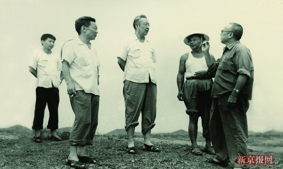1978年8月,习仲勋(左三)在广东惠阳农村调研。在清华大学读书的习近平(左一)利用暑假时间参加社会实践,随同父亲一起下乡。