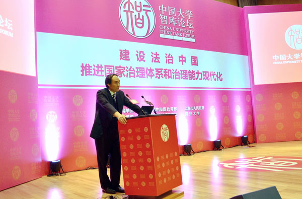 此次论坛由教育部、上海市人民政府主办,复旦大学和智库论坛秘书处主办,主题为“建设法治中国,推进国家治理体系和治理能力现代化”。 来自全国人大、全国政协、最高人民法院、最高人民检察院、中国法学会的相关部门领导和高校知名专家作了专题报告。