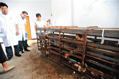 2010年9月初,王大峰被家人及当地警方锁在笼中,笼外是前来查看其病情的北京武警三院神经外科的医生。