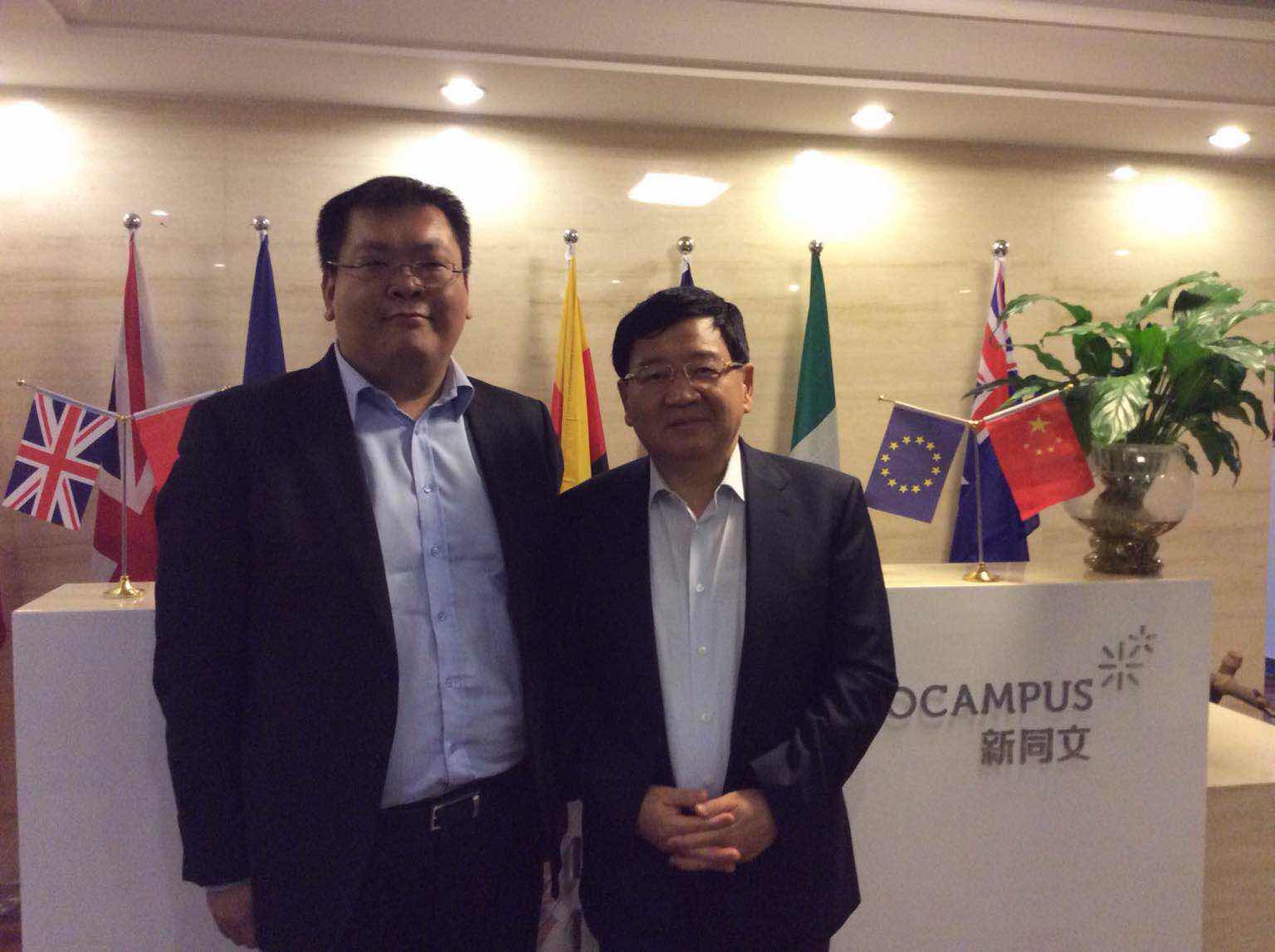2012年,新同文获得真格基金投资,真格基金创始人徐小平成为新同文联合创始人。图为新同文总裁王啸宇(左)和徐小平在一起。