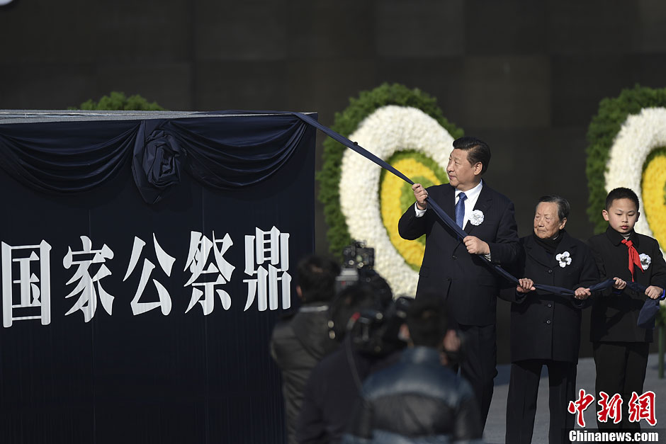12月13日是首个南京大屠杀死难者国家公祭日。当天上午10时,国家公祭仪式在侵华日军南京大屠杀遇难同胞纪念馆举行。中共中央总书记、国家主席、中央军委主席习近平与南京大屠杀幸存者代表、少先队员代表为国家公祭鼎揭幕。中新社记者 廖攀 摄