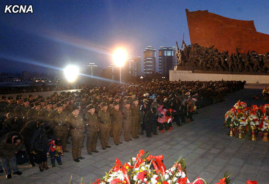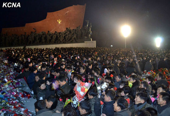 17日凌晨,朝鲜民众凌晨前往平壤万寿台悼念金正日并默哀。