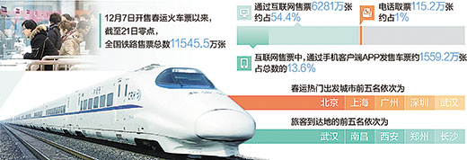 此外,12月12日上线的手机客户端2.0版改善了用户购票体验,简化了购票操作,同时优化了网站购票流程。据介绍,春运火车票开售以来,手机客户端发售车票占比13.6%,12306网站占比40.9%。