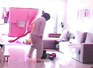 拍摄视频的镜头从画面上来看应该是客厅一侧离地1米左右高的地方,视频画面的远端是阳光充足的阳台,上面挂着晾晒的被子和衣物,还有一个儿童滑梯,客厅宽敞明亮。