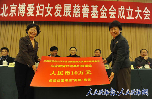 2014年12月21日,北京博爱妇女发展慈善基金会成立大会暨全国政协机关妇委会、人民政协报社和北京博爱妇女发展慈善基金会共同发起的,向安徽省六安市舒城县20位“贫困母亲两癌患者”救助捐赠仪式在全国政协礼堂举行。