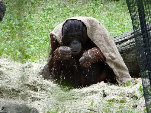 图为红毛猩猩将布袋盖在身上御寒。(照片由台北市立动物园提供)