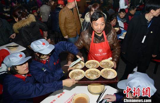 工作人员为前来纪念毛泽东的民众端上“福寿面”?!⊙罨濉∩?/div>