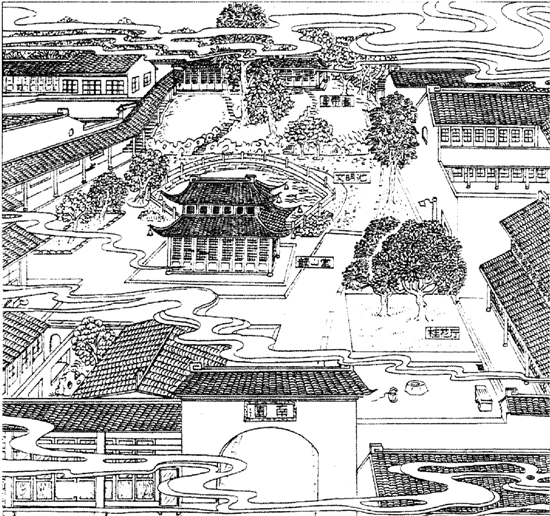 在上世纪二三十年代杭十中校园实景图。其中的南园是中式园林,小巧玲珑,极富诗意。现在仍存于校园中(画圈处为上世纪的南园,上图为现南园)。