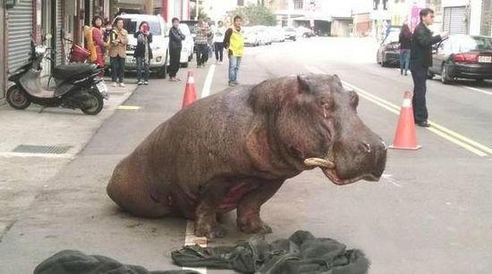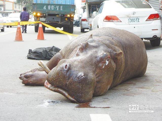 台湾苗栗发生一起交通事故,一只两吨重的河马在由货车运送途中,疑因受到惊吓,从货车通气孔跳出,瘫坐在路中央,奄奄一息,牙齿也被撞断,可能是因为太痛,大河马还留下眼泪,民众也纷纷出来观看,表示心疼。饲养方随后到场对其施打麻醉剂,再出动吊车将其吊走。