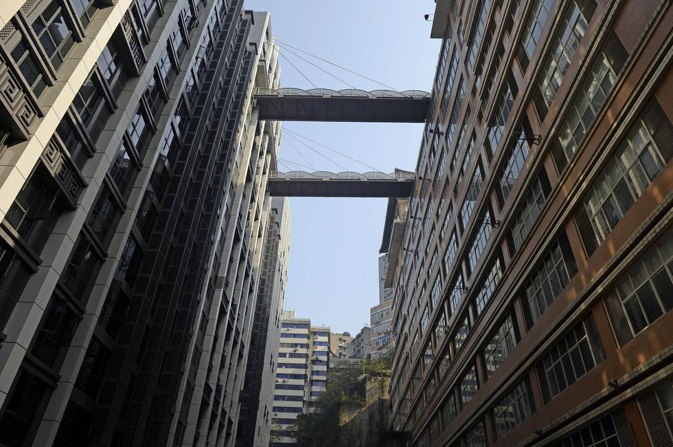 2014年12月29日,重庆解放碑附近一新建楼盘,为了出入方便,在22层高楼的外墙上,分别搭建了两个钢结构的人行天桥。