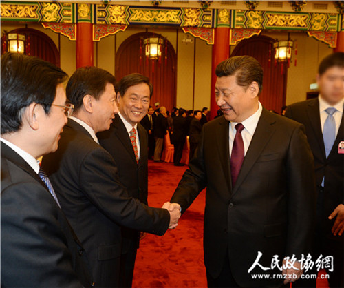 2014年12月31日,全国政协在北京举行新年茶话会。中共中央总书记、国家主席、中央军委主席习近平在茶话会上同与会人士亲切交谈。记者 姜贵东 摄